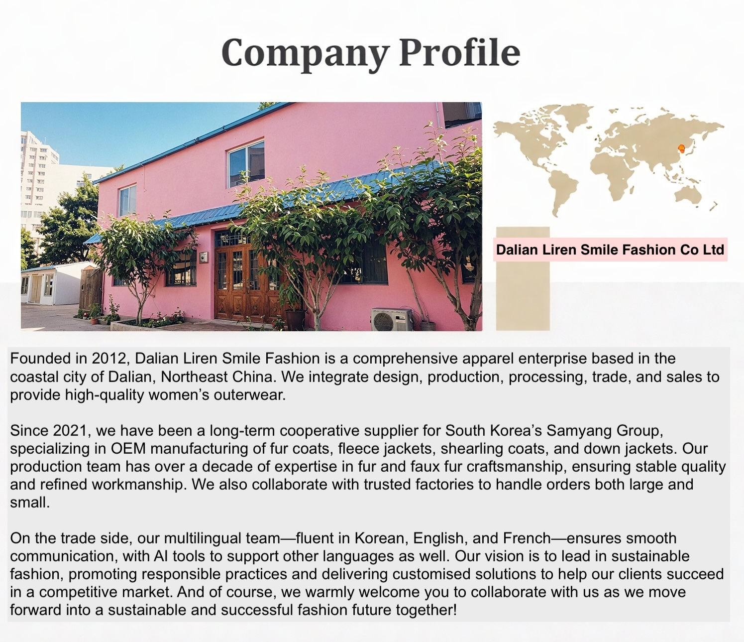 Основные продукты:Пальто из искусственной овчины, из искусственного меха, парка, пуховик, флисовая куртка